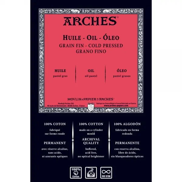 Each sheet of Arches Oil Paper measures 56 x 76cm (22 x 30 inches) 300gsm / 140lbs weight 100% Cotton Neutral pH with Arches watermark. Beautiful deckle edges medium grain Cold Pressed surface. No Optical Brighteners added Permanent artist quality paper. 4 deckled edge paper that is made specifically for oil painting. Made in France, this unique paper has the look and feel of traditional papers from Arches. The paper has a built in oil barrier that absorbs water, solvents and binders while the paint and pigments remain on the papers surface.