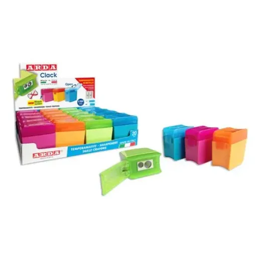 A handy 2 in 1 pencil sharpener and eraser in a colour plastic case. Twist to reveal the single hole sharpener - this contains a mess free receptacle that can be easily emptied after use. Remove the lid to use the soft eraser.