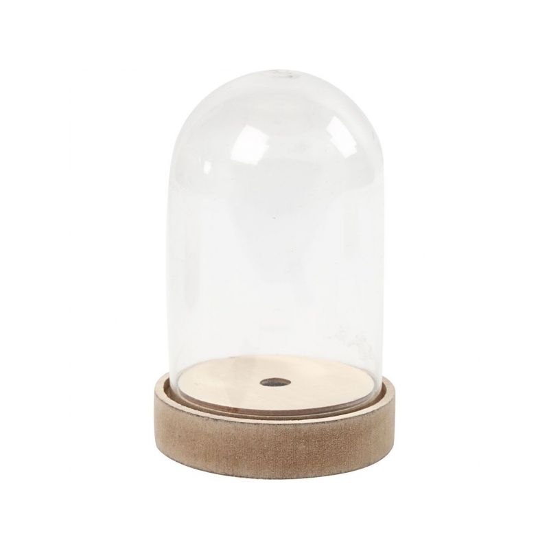 A round bell of clear plastic with loose foot and top plate made of MDF. Is used as a small display for various decorations. Can be fed a battery-powered light chain from the bottom of the foot cavity (diam. 3.5cm)