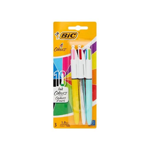The BIC 4-Color ball pen adds versatility to your everyday writing. You are able to switch between four colors at the click of your thumb. This is a perfect pen when recording data in different colors. The colors are: blue, black, red or yellow