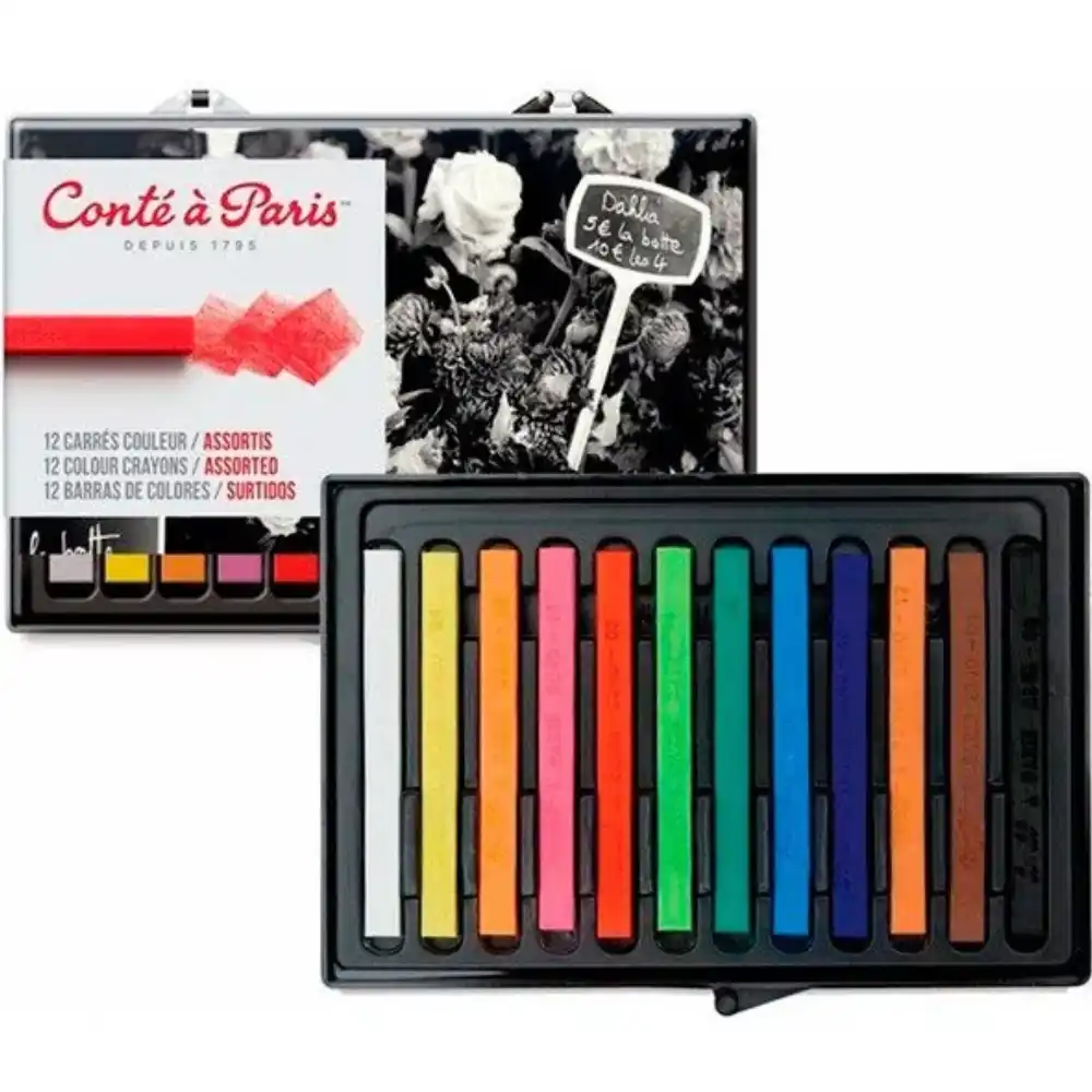 • The set includes 12 chalk in the colors: bistre, dark green, bright red, medium yellow, black, pink, orange, white, yellow ochre, cobalt blue, Saint Michel green, dark ultramarine.