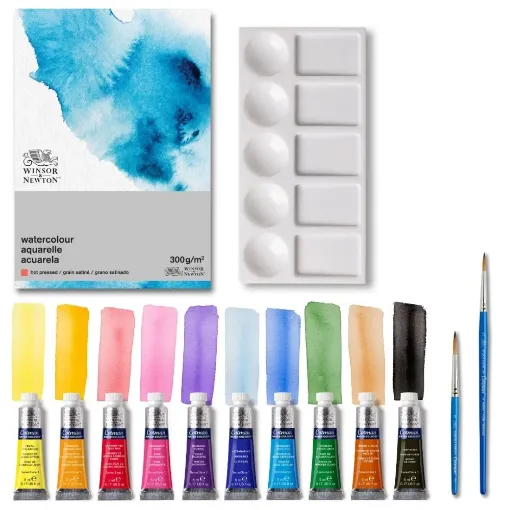 Set includes: 10 x 5ml tubes, 2 Cotman brushes, 1 Cotman pad, and additional essential watercolour items.