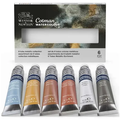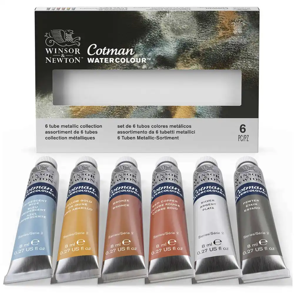 Achieve shimmering washes, glittering highlights and iridescent effects with Winsor & Newton Cotman Metallic Watercolours. Includes assorted metallic colors. Good transparency. Excellent tinting strength and working properties