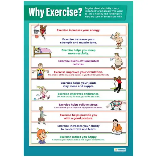 The Why Exercise? Wall Chart is ideal for classroom walls and school hallways. The large A1 size (840mm x 594mm) makes the bright and informative chart highly readable from a distance, complementing every learning environment.