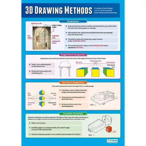 The 3D Drawing Methods Wall Chart is ideal for classroom walls and school hallways. The large A1 size (840mm x 594mm) makes the bright and informative chart highly readable from a distance, complementing every learning environment.
