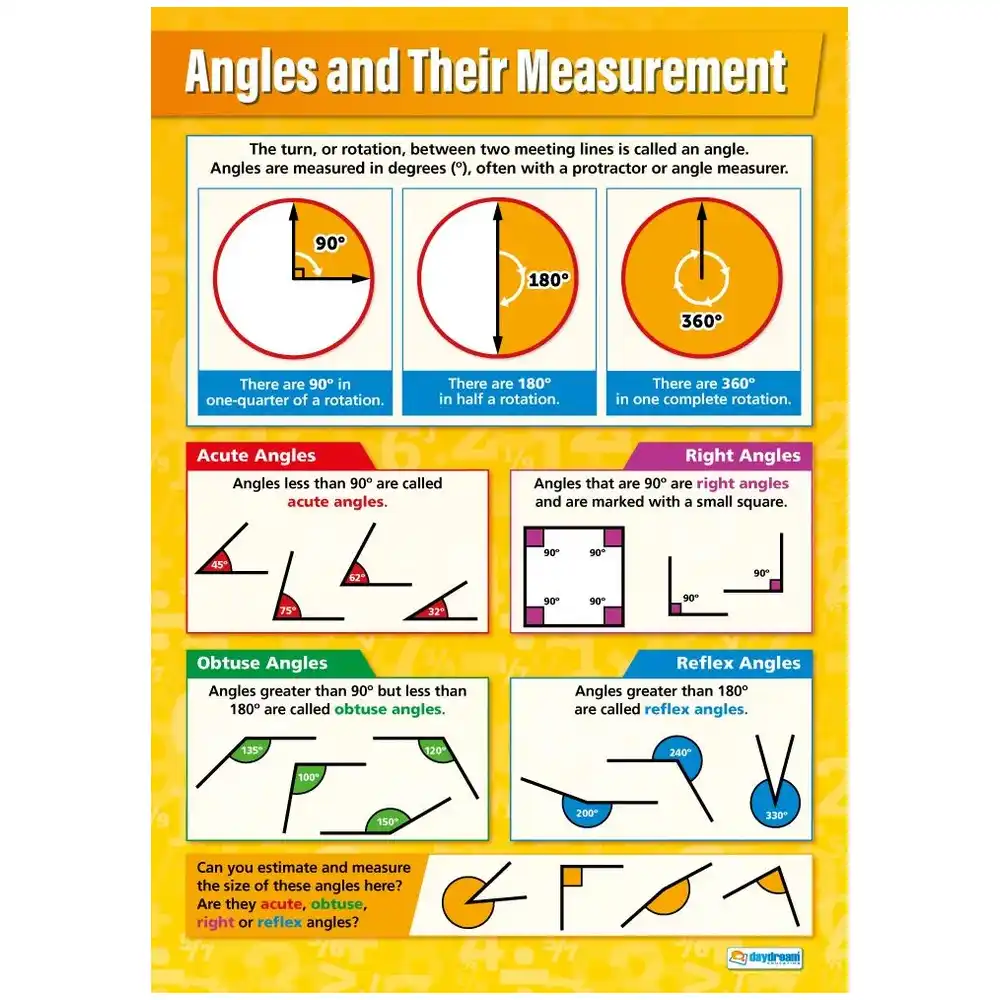 The Angles and their Measurement Wall Chart is ideal for classroom walls and school hallways. The large A1 size (840mm x 594mm) makes the bright and informative chart highly readable from a distance, complementing every learning environment.