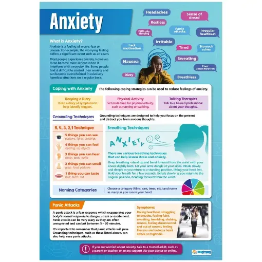 Daydream's Anxiety poster is part of our Mental Health range and has been designed to help students better understand their mental health. The informative resource details the different ways anxiety and panic can present themselves to help students identify when they may be experiencing anxiety.