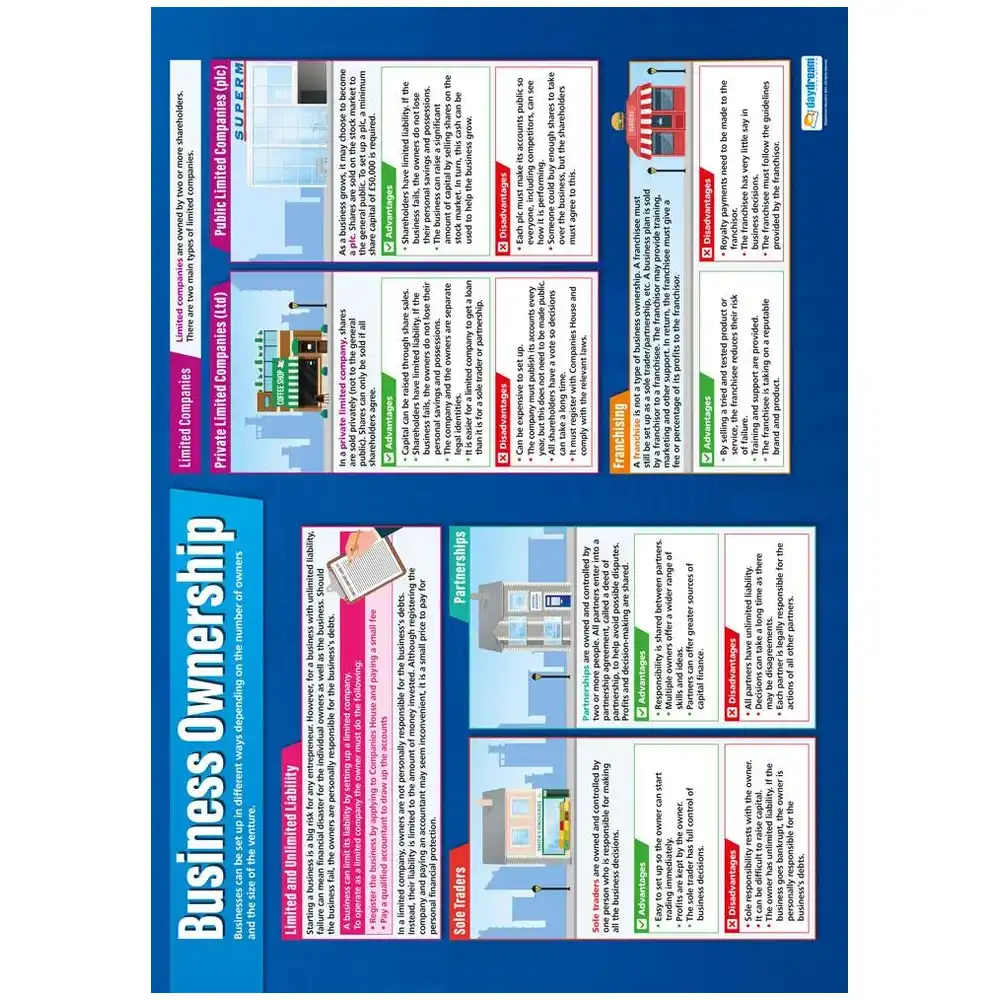 The Business Ownership poster is the ideal learning aid to showcase key information on sole traders, partnerships, limited companies and franchises. With clear supporting examples and bitesize chunks of information, this poster makes the topic simple and easy to remember for learners.