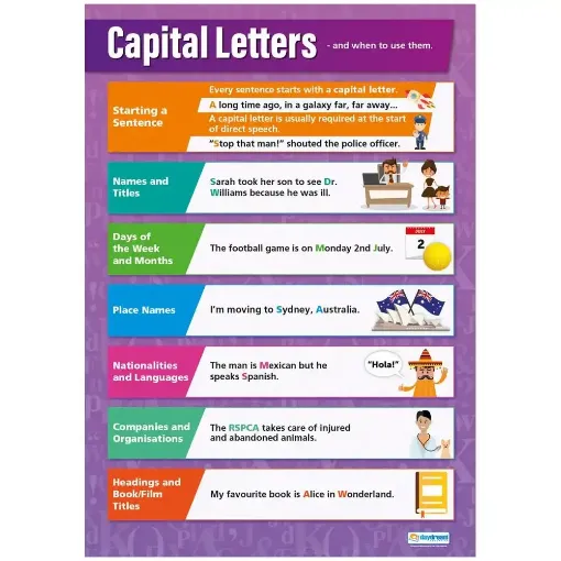 The Capital Letters Wall Chart is ideal for classroom walls and school hallways. The large A1 size (840mm x 594mm) makes the bright and informative chart highly readable from a distance, complementing every learning environment.