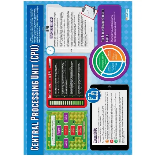 Our Central Processing Unit Wallchart is an extremely effectual resource for students who are learning about the tasks performed by the CPU. The chart simplifies essential information covering The Fetch-Decode-Execute Cycle, CPU Performance, and mobile CPUs.