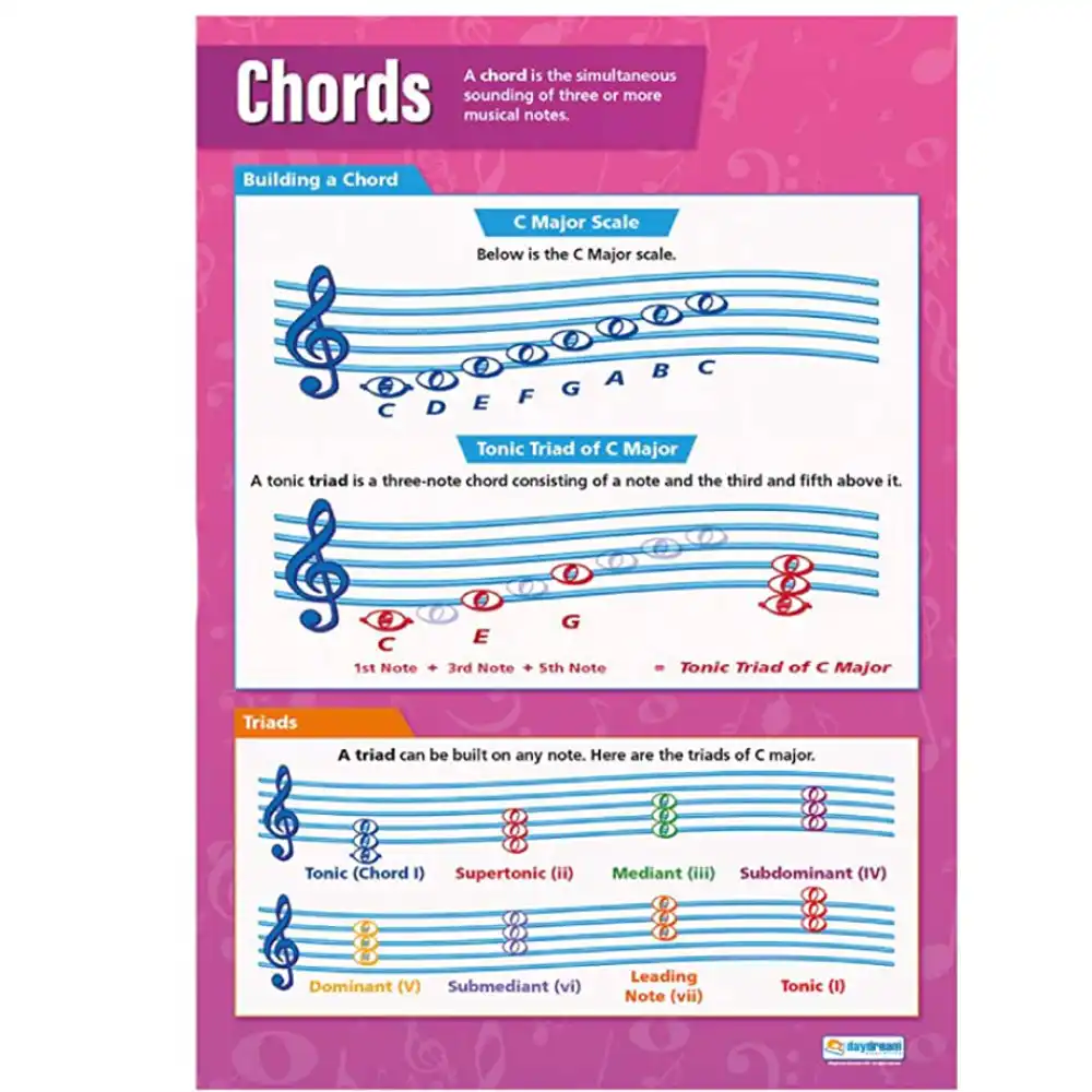 The Chords Wall Chart is ideal for classroom walls and school hallways. The large A1 size (840mm x 594mm) makes the bright and informative chart highly readable from a distance, complementing every learning environment.