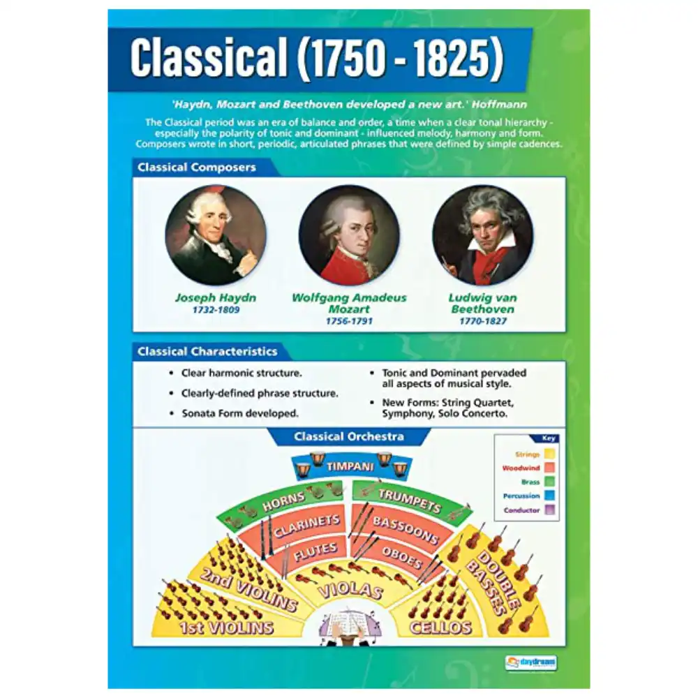 The Baroque poster is ideal for classroom walls and school hallways. The large A1 size makes the bright and informative chart highly readable from a distance, complementing every learning environment.