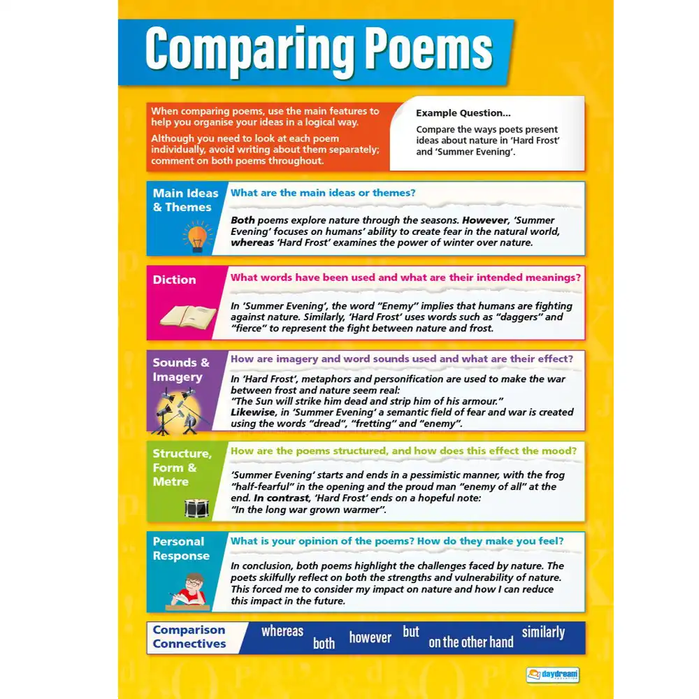 This Comparing Poems Poster is part of our English range. The clear and concise poster gives learners a guide on how to compare poems. Split in to 5 sections, the poster outlines the key points that need to be taken in to consideration when Comparing Poems. These include main ideas & themes, diction, sounds & imagery, structure, form & metre and personal response.