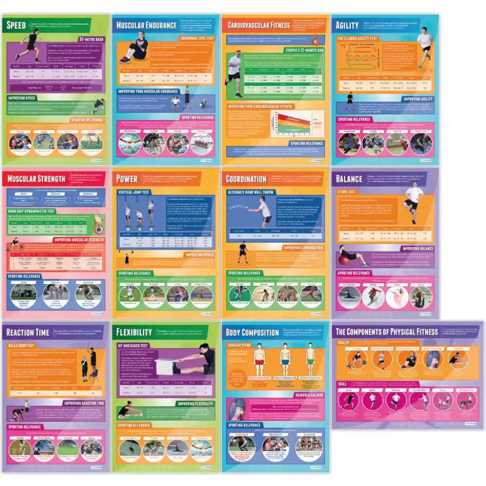 Components of Physical Fitness Set of 12 laminated posters is ideal for classroom walls and school hallways. The large A1 size makes the bright and informative chart highly readable from a distance, complementing every learning environment.