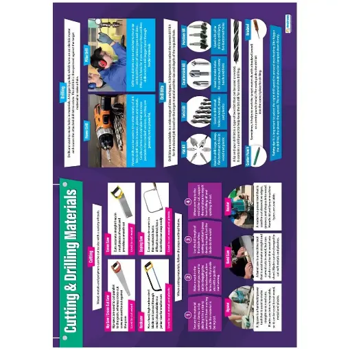 The poster's expert-approved information explains in plain English every aspect of this challenging Design and Technology topic. Alongside each value-stuffed information block is an attractive, relevant image which makes the fascinating topic of cutting and drilling materials easy to take in and recall. The poster's large A1 size, appealing design and visual colour palette make it a great addition to any Design and Technology learning environment.