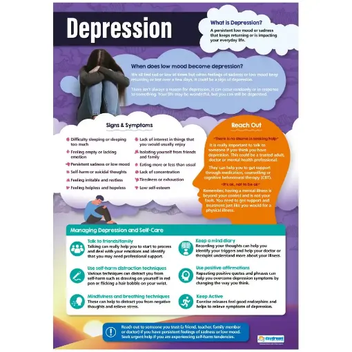 This Depression poster is part of our Mental Health range and has been designed to help students better understand their mental health. Using appropriate language, this poster is a useful resource that gives students an overview of depression to help them consider whether they may be depressed and need support.