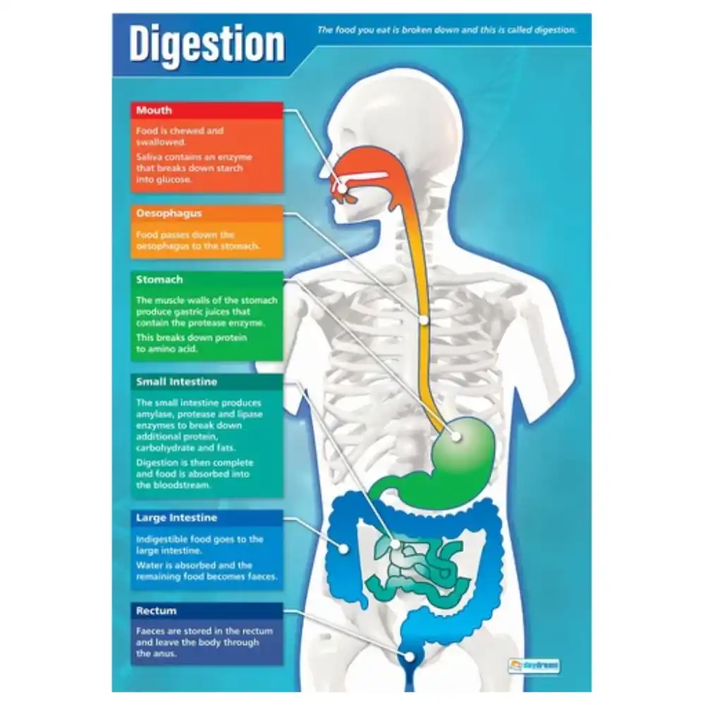The Digestion Wall Chart is ideal for classroom walls and school hallways. The large A1 size (840mm x 594mm) makes the bright and informative chart highly readable from a distance, complementing every learning environment.
