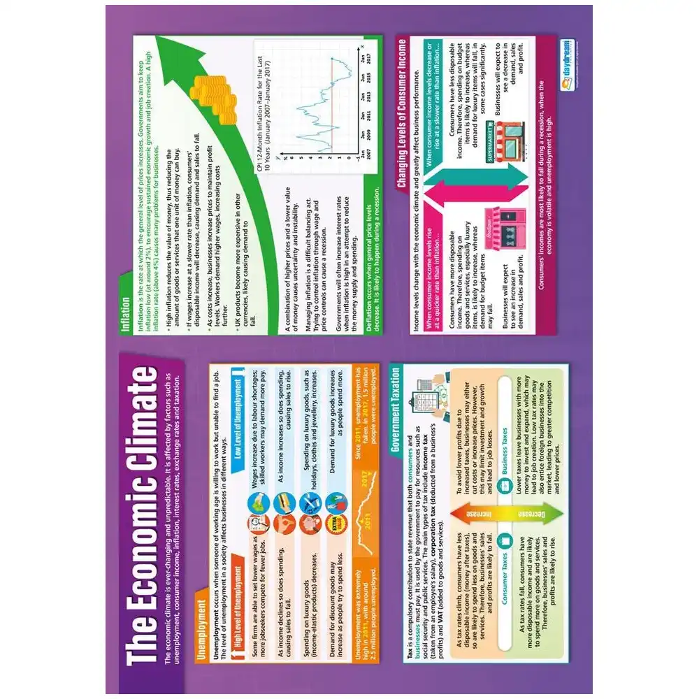 The Economic Climate poster is part of our Business range. Bright and informative, our readable poster explores the impacts made by fluctuations in rates of unemployment, government taxation, inflation and consumer income to help students feel confident and exam-ready.