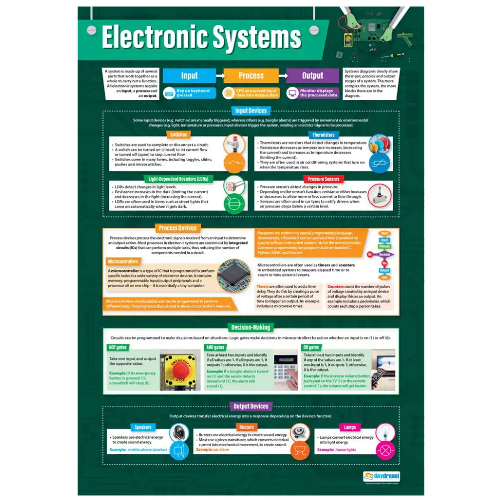 This Electronic Systems poster is a colourful and engaging wall chart that teaches school pupils about systems diagrams and circuits. It also addresses important topics of input devices such as switches and resistors, as well as process devices, decision-making logic gates, and output devices.