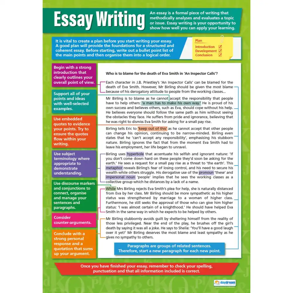 Our Essay Writing Poster is part of our English Grammar range. The colourful and instructive poster informs learners about Essay Writing and also highlights what learners must remember to include in an essay. The poster provides an example of an essay with parts of the text highlighted to show learners what needs to be included in their writing.