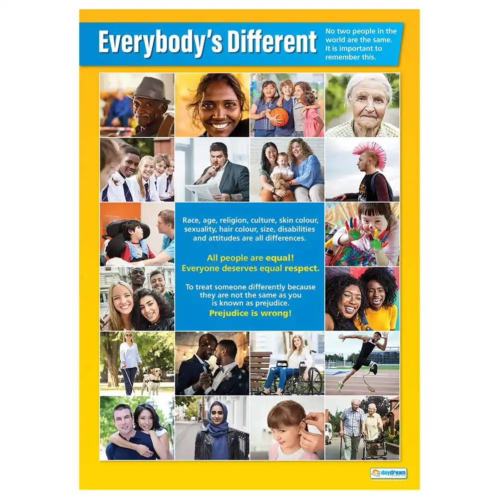 The Everybody's Different Wall Chart is ideal for classroom walls and school hallways. The large A1 size (840mm x 594mm) makes the bright and informative chart highly readable from a distance, complementing every learning environment.