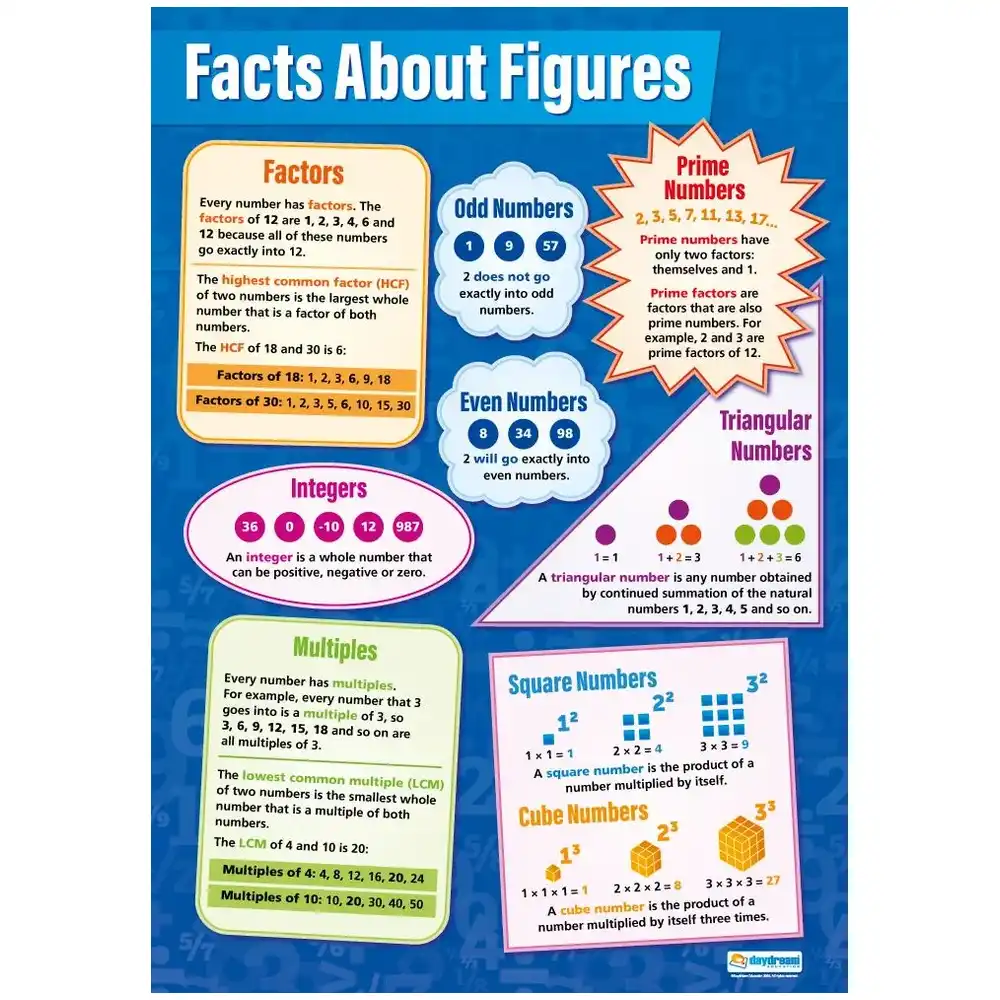 The Facts About Figures poster is an excellent part of our Math series. This vibrant and colorful poster covers critical areas in math including factors, odd numbers, prime numbers, even numbers, triangular numbers, integers, square numbers, and multiples. It has been carefully designed to provide high definition figures that are supported by examples and engaging images. The poster will hold students' attention allowing them to clearly and concisely understand Facts About Figures.