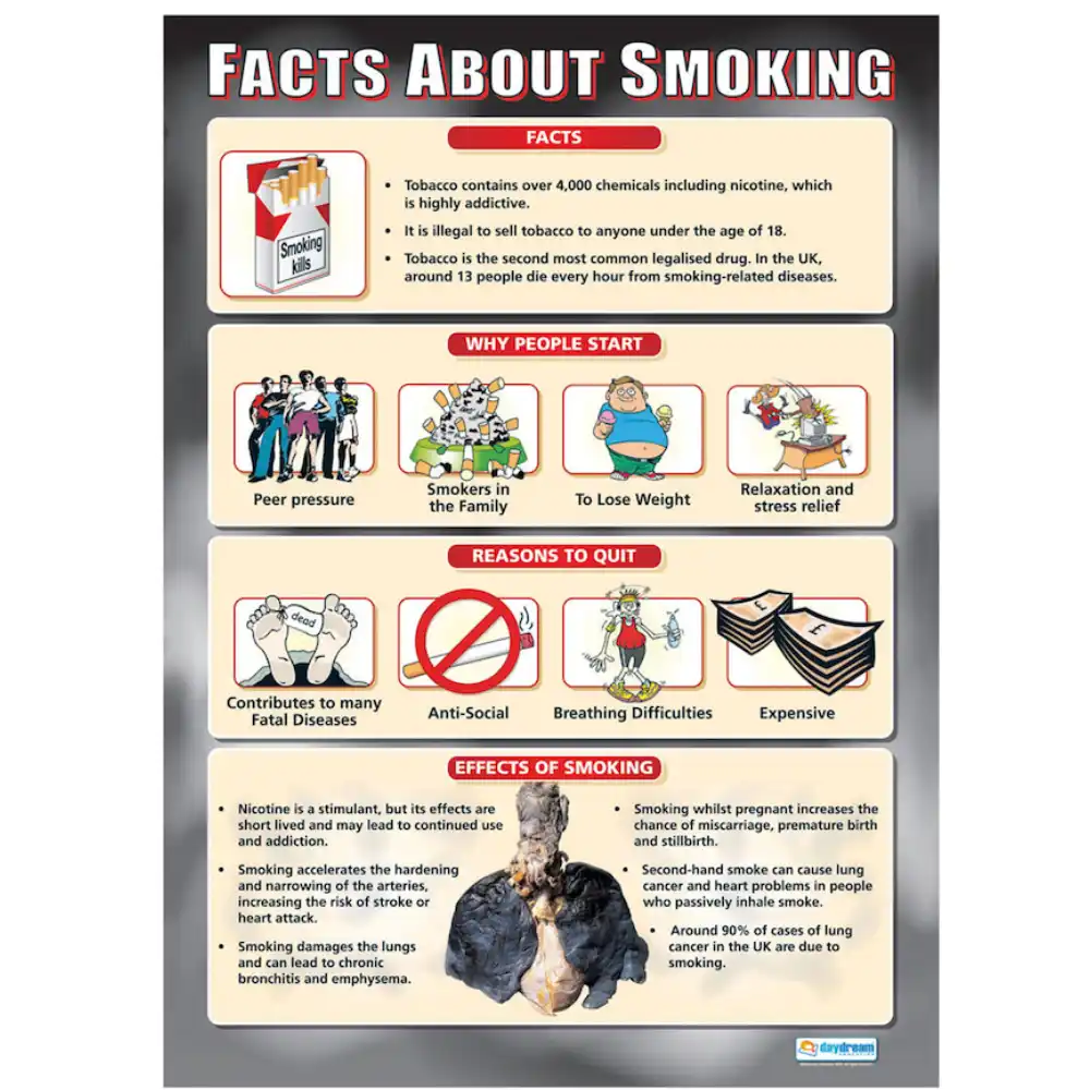 The Smoking poster is ideal for classroom walls and school hallways. The large A1 size makes the bright and informative chart highly readable from a distance, complementing every learning environment.