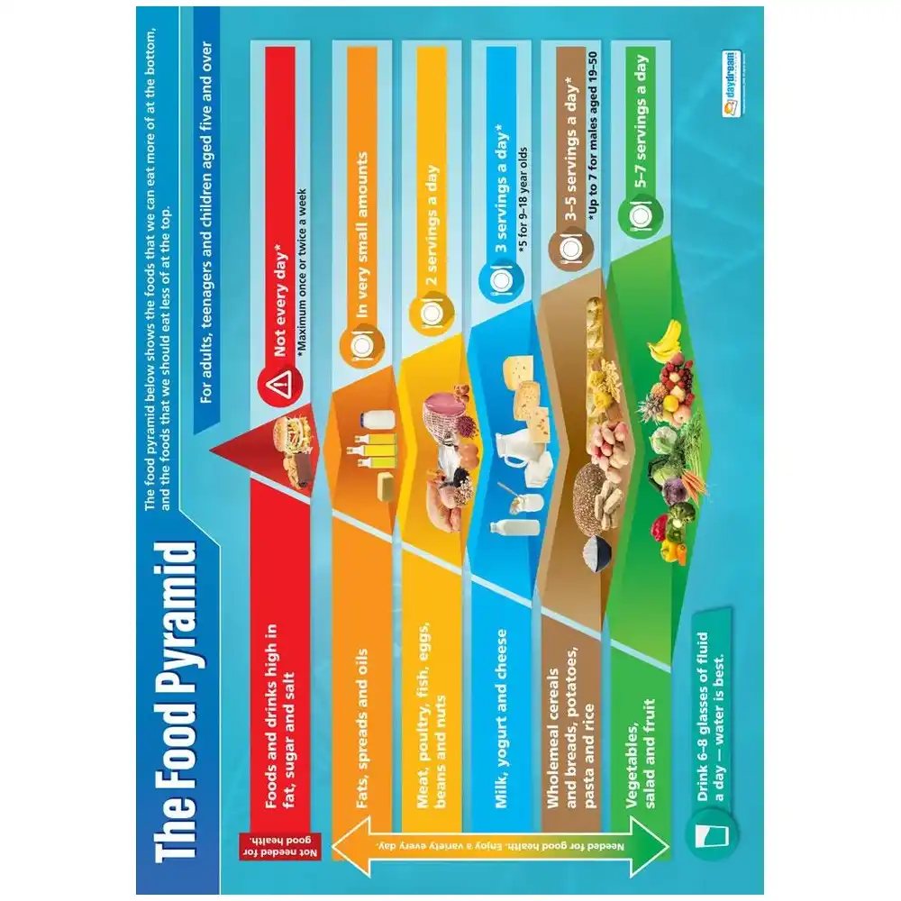 The Food Pyramid Wall Chart is ideal for classroom walls and school hallways. The large A1 size (840mm x 594mm) makes the bright and informative chart highly readable from a distance, complementing every learning environment.
