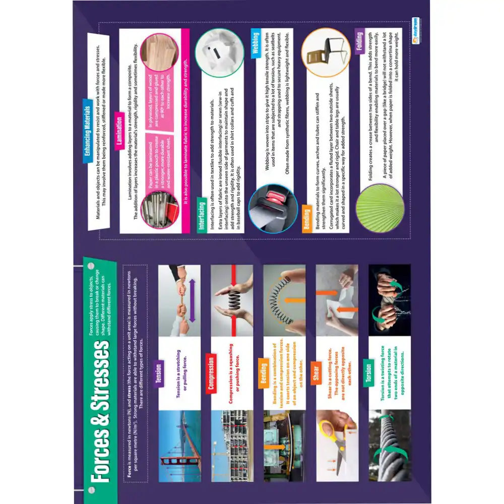 Its enlightening information clearly explains every component of this challenging ' Design and Technology 'topic. Alongside each accessible information block is a vivid, relevant image which makes the all-important topic of forces and stresses easy to understand and relate to situations in the real world. Optimised to help visual learners, the poster' large A1 size, striking design and eye-catching colours make it the perfect addition to any Design and Technology class.