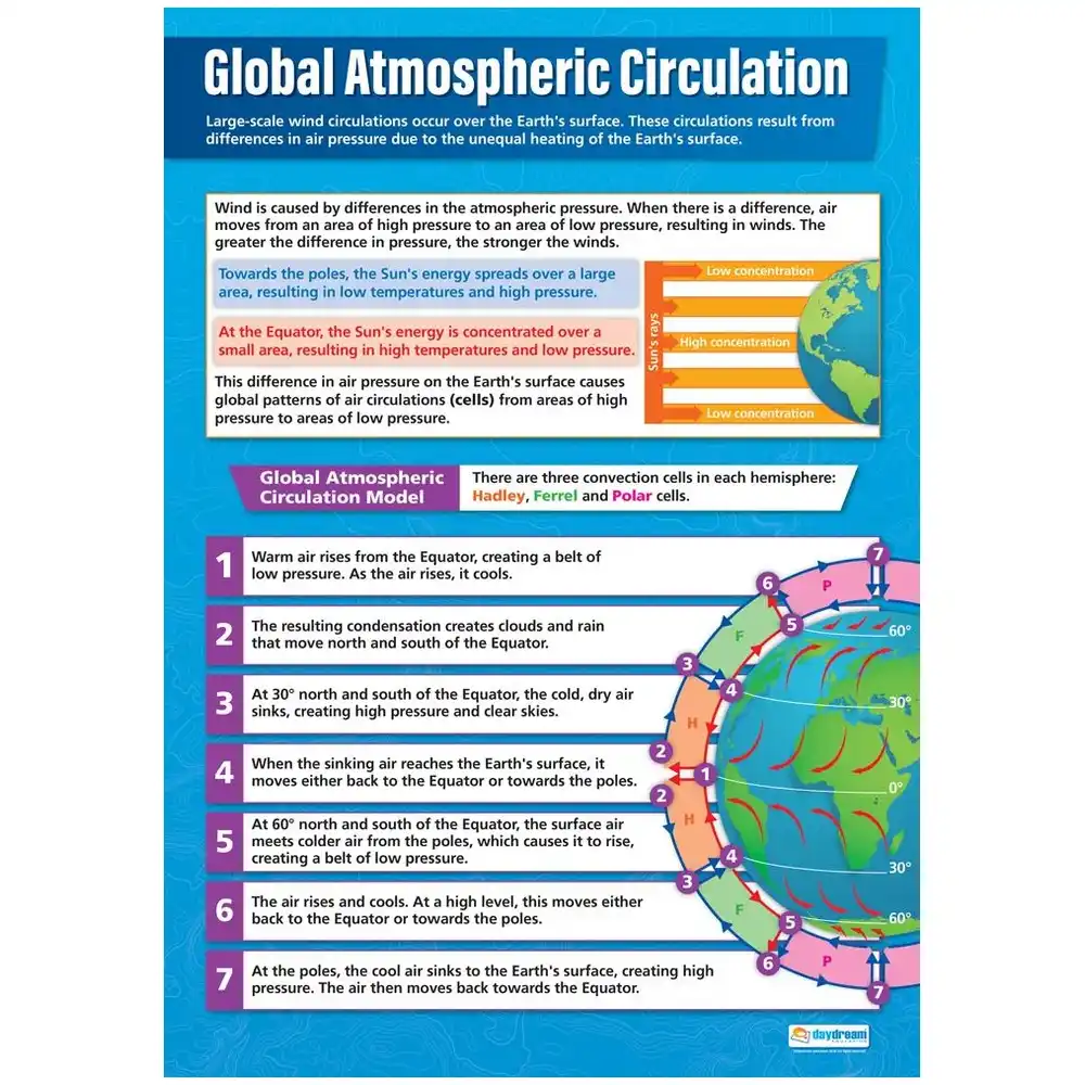 Daydream Education's Global Atmospheric Circulation poster is a colourful and engaging wall chart that will teach pupils about large-scale wind circulations and the global atmospheric circulation model. Seven simple steps explaining the Hadley, Ferrell, and Polar convection cells, alongside a clear labelled image, makes the complex topic of wind circulations easy to understand. The poster's large A1 size, bold design and vivid colours ensure it will be a brilliant addition to any geography learning environment.