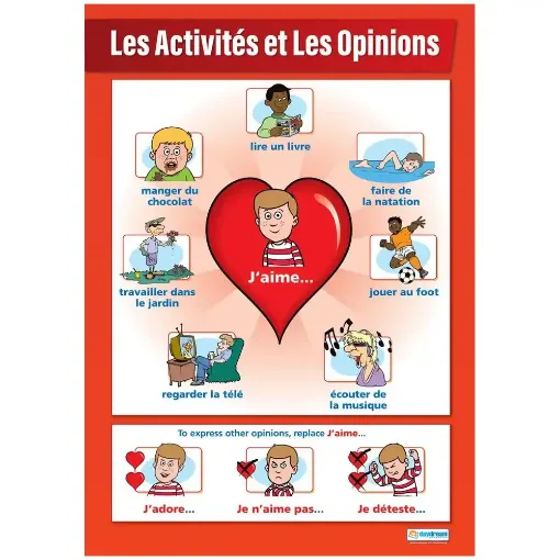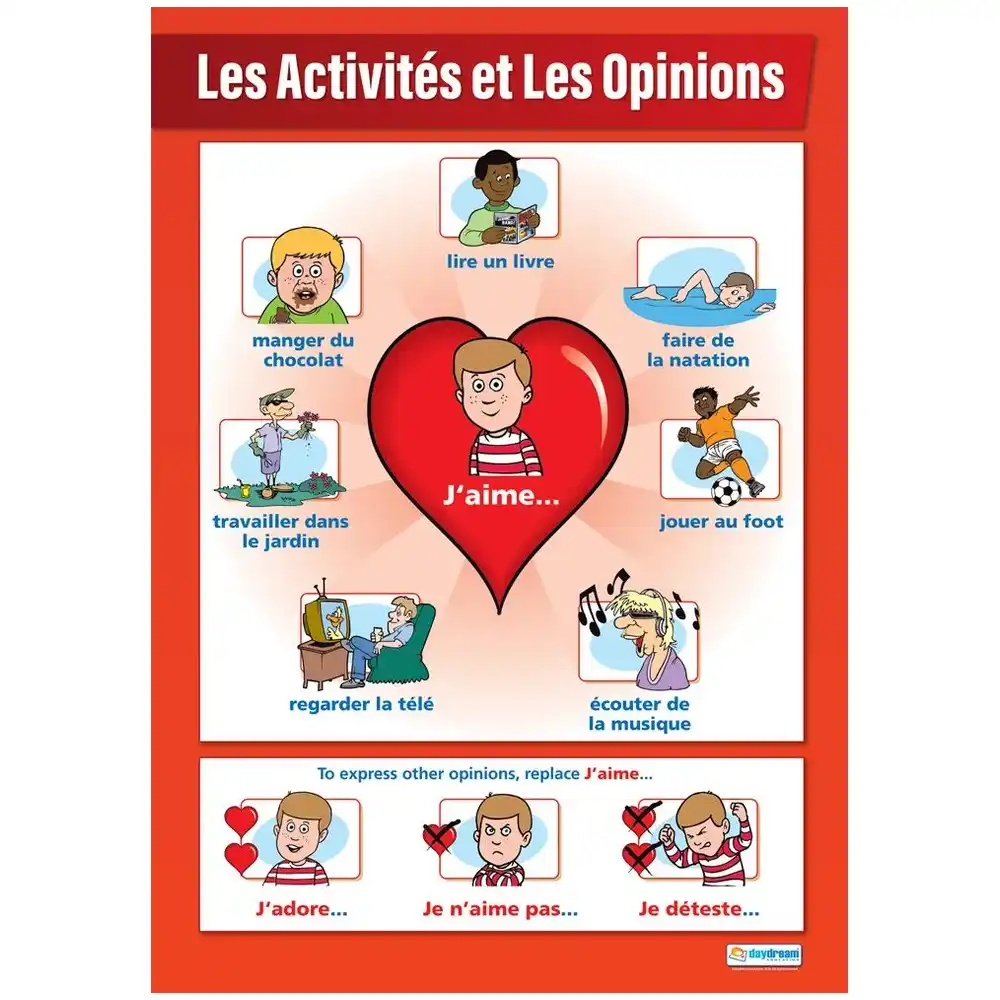 The Les Activities et les Opinions poster is ideal for classroom walls and school hallways. The large A1 size makes the bright and informative chart highly readable from a distance, complementing every learning environment.