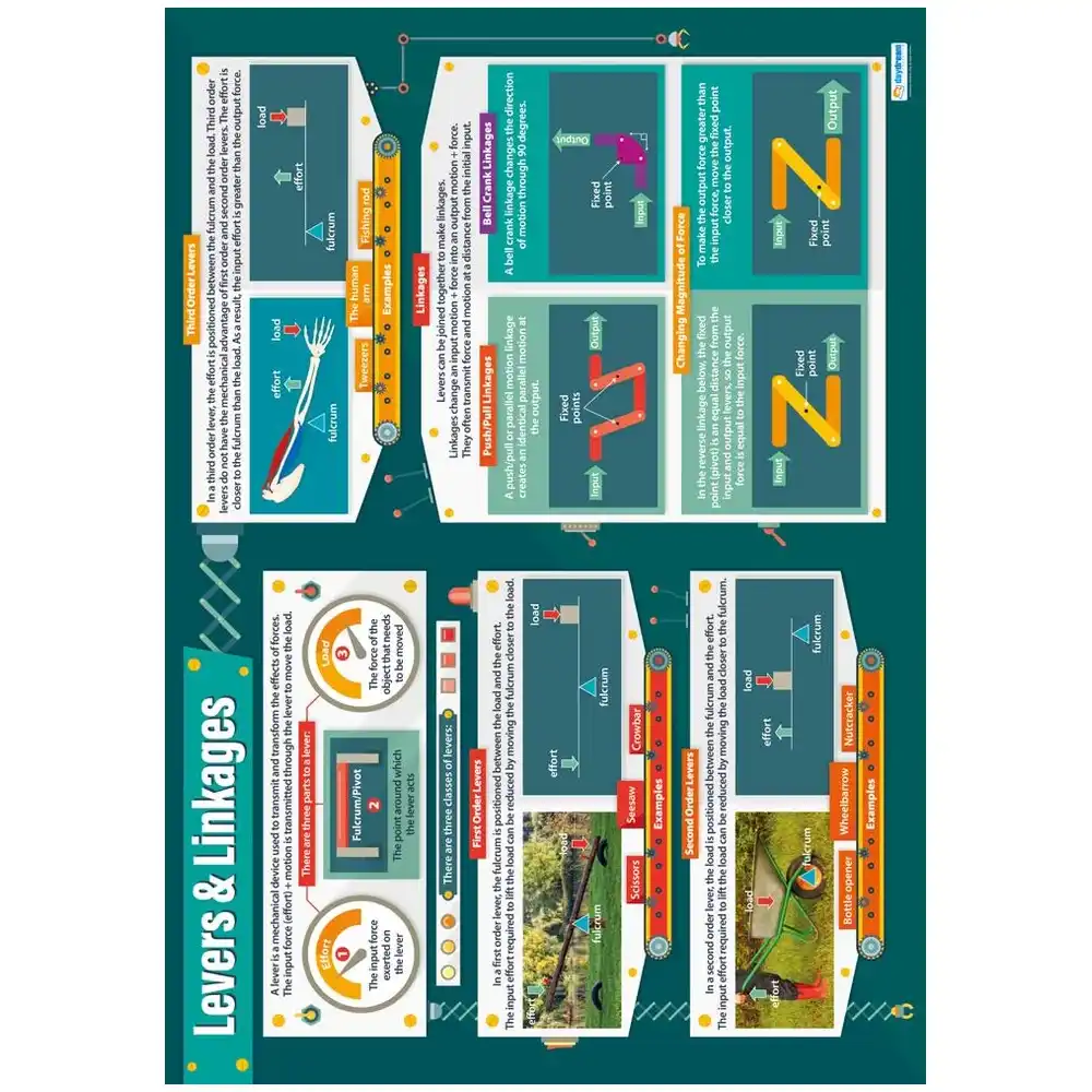 The Lever and Linkages Wall Chart is ideal for classroom walls and school hallways. The large A1 size (840mm x 594mm) makes the bright and informative chart highly readable from a distance, complementing every learning environment.