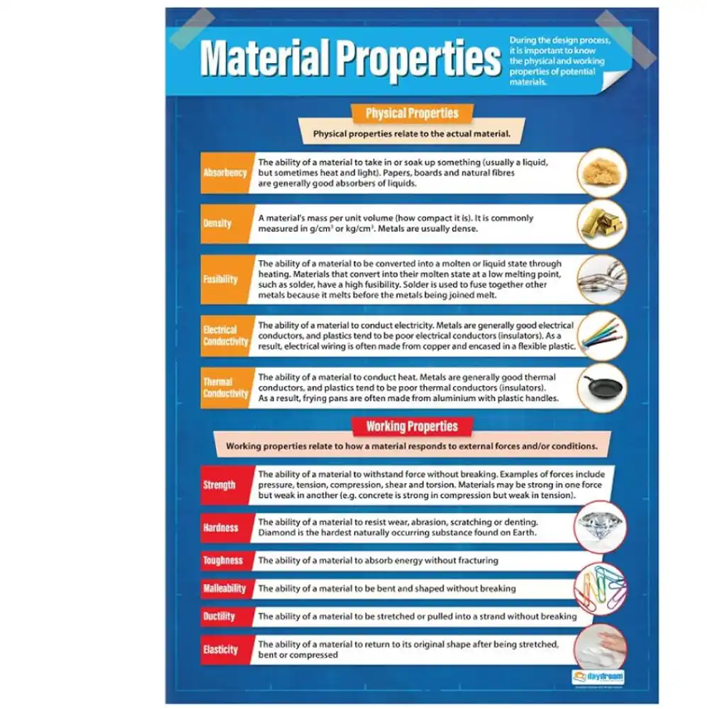 This Material Properties poster is a colourful and engaging wall chart. It teaches school pupils about the importance of knowing the physical and working properties of potential materials during the product design and development process. Physical properties discussed include absorbency, density, fusibility, electrical conductivity and thermal conductivity. Working properties outlined in the poster include strength, hardness, toughness, malleability, ductility and elasticity.
