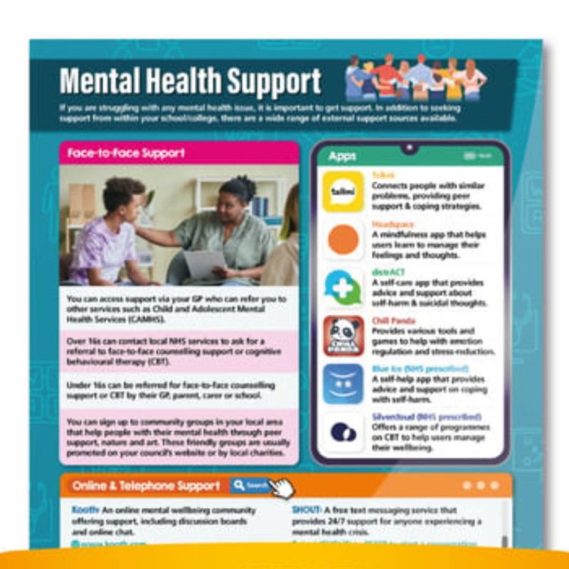 Mental health support poster that directs students to helpful UK sources to get support and guidance from mental health professionals and charities.