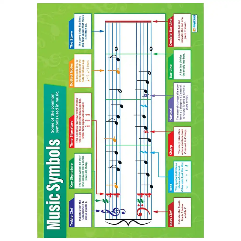 The Music Symbols Wall Chart is ideal for classroom walls and school hallways. The large A1 size (840mm x 594mm)makes the bright and informative chart highly readable from a distance, complementing every learning environment.