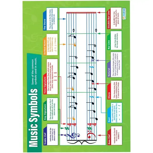 The Music Symbols Wall Chart is ideal for classroom walls and school hallways. The large A1 size (840mm x 594mm) makes the bright and informative chart highly readable from a distance, complementing every learning environment.