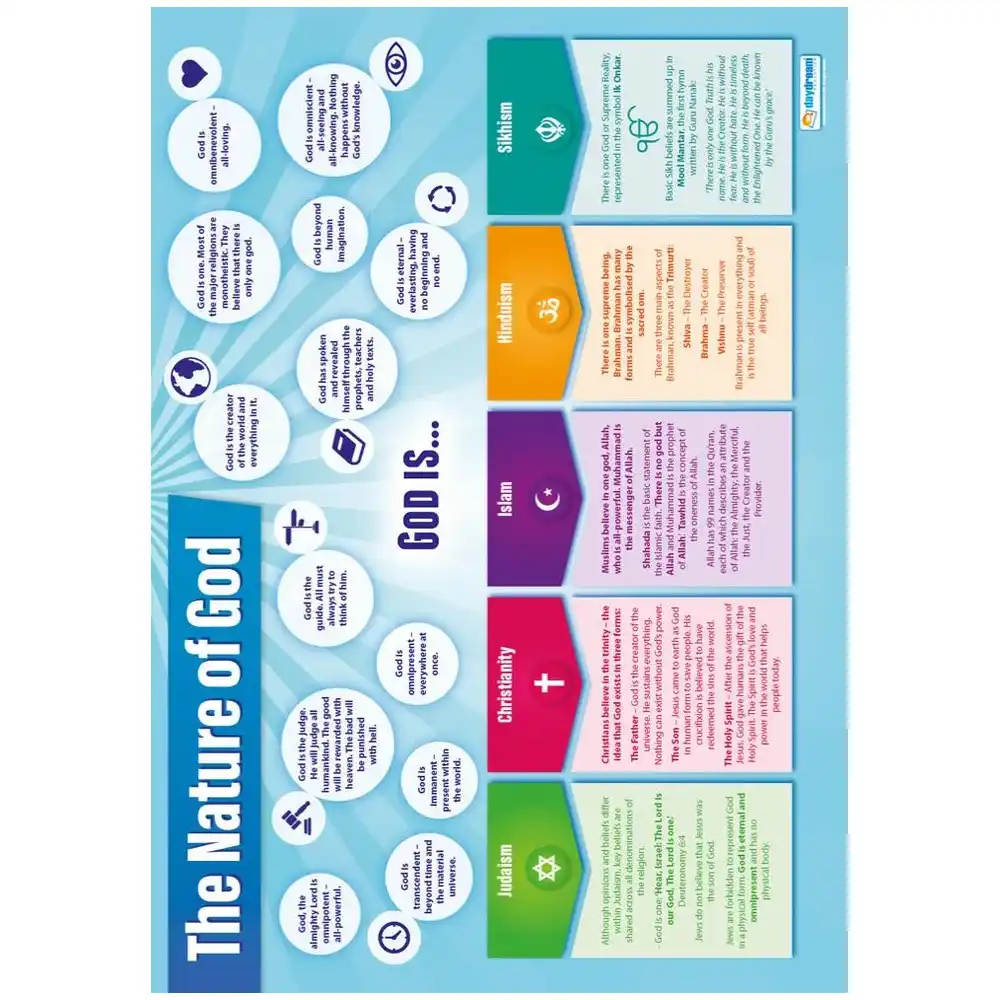 Our The Nature of God Poster is part of our Religious Studies range. The enthusing and engaging poster presents a colourful mind map full of information about how different religions see God and what their beliefs and opinions are about God. These religions include Judaism, Christianity, Islam, Hinduism and Sikhism. Each section of the poster contains a quote or hymn about God that is specific to that religion. The sections of the poster contain information that learners require to grasp the tricky subject that is The Nature of God.
