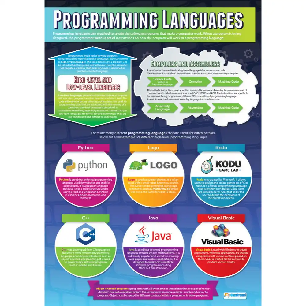 Our Programming Languages Wallchart is the best learning and teaching tool available. The attention-grabbing computer science poster is guaranteed to improve student understanding while perking up your school hallways and classrooms. This poster offers an excellent overview of programming languages including C++, Java, Python, Logo, Kodu, and Visual Basics.