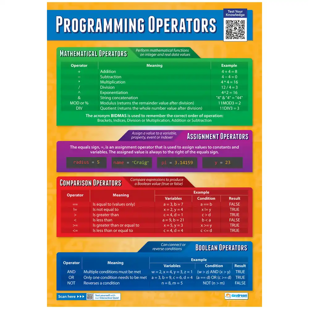 Part of the Computer Science range, this Programming Operators poster provides a useful selection of key operators for specific functions through easy-to-understand tables. Covering a range from mathematical to assignment, comparison to Boolean, this is a learning aid which identifies and explains clearly each of the operators required for the curriculum in a fun and classroom-friendly format.
