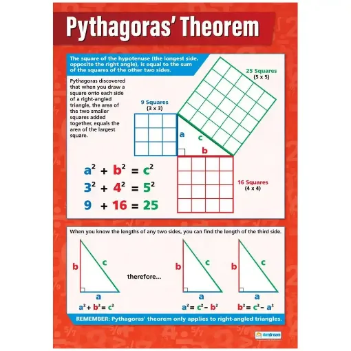The Pythagoras' Theorem Wall Chart is ideal for classroom walls and school hallways. The large A1 size (840mm x 594mm) makes the bright and informative chart highly readable from a distance, complementing every learning environment.