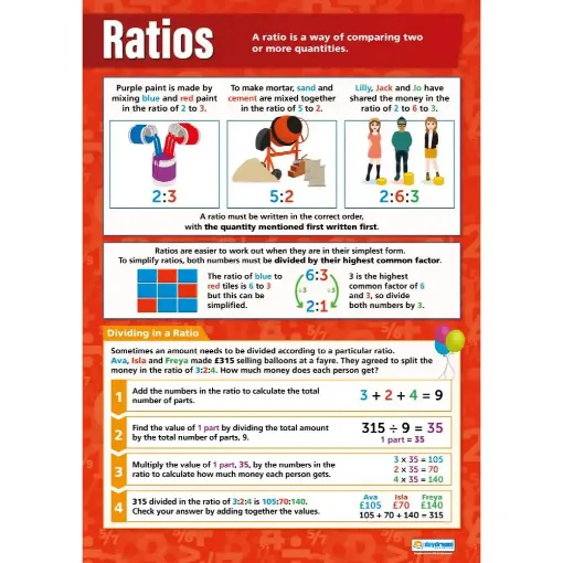 The Ratio Wall Chart is ideal for classroom walls and school hallways. The large A1 size (840mm x 594mm) makes the bright and informative chart highly readable from a distance, complementing every learning environment.