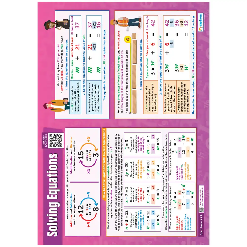 This Solving Equations Poster is part of our Maths range. The colourful and comprehensive poster explains clearly about the inverse of addition, subtraction, multiplication and division. Throughout the poster contains plenty of examples, diagrams and clear text making Soling Equations more simple to understand for the learner.