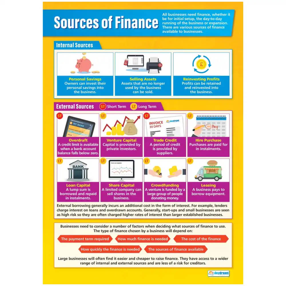 The Sources of Finance Wall Chart is ideal for classroom walls and school hallways. The large A1 size (840mm x 594mm) makes the bright and informative chart highly readable from a distance, complementing every learning environment.