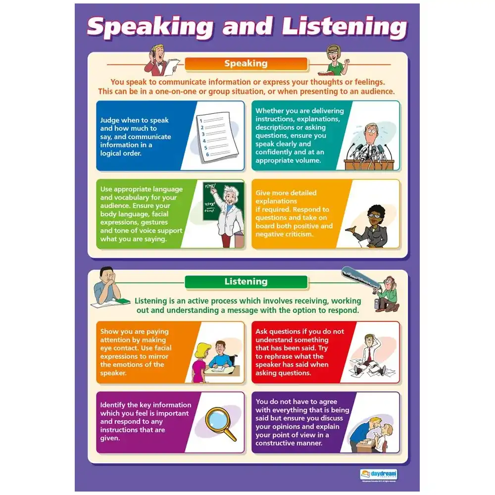 The Speaking and Listening Wall Chart is ideal for classroom walls and school hallways. The large A1 size (840mm x 594mm) makes the bright and informative chart highly readable from a distance, complementing every learning environment.