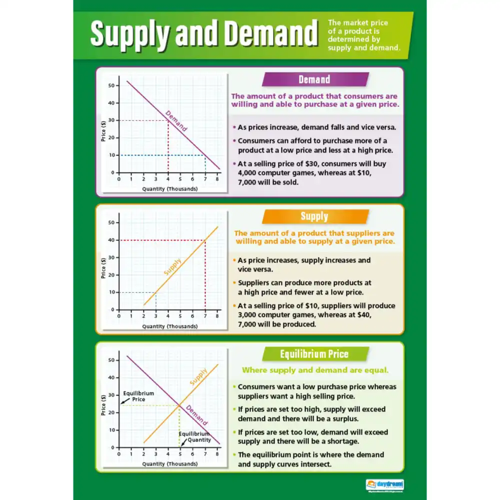The Supply and Demand Wall Chart is ideal for classroom walls and school hallways. The large A1 size (840mm x 594mm) makes the bright and informative chart highly readable from a distance, complementing every learning environment.