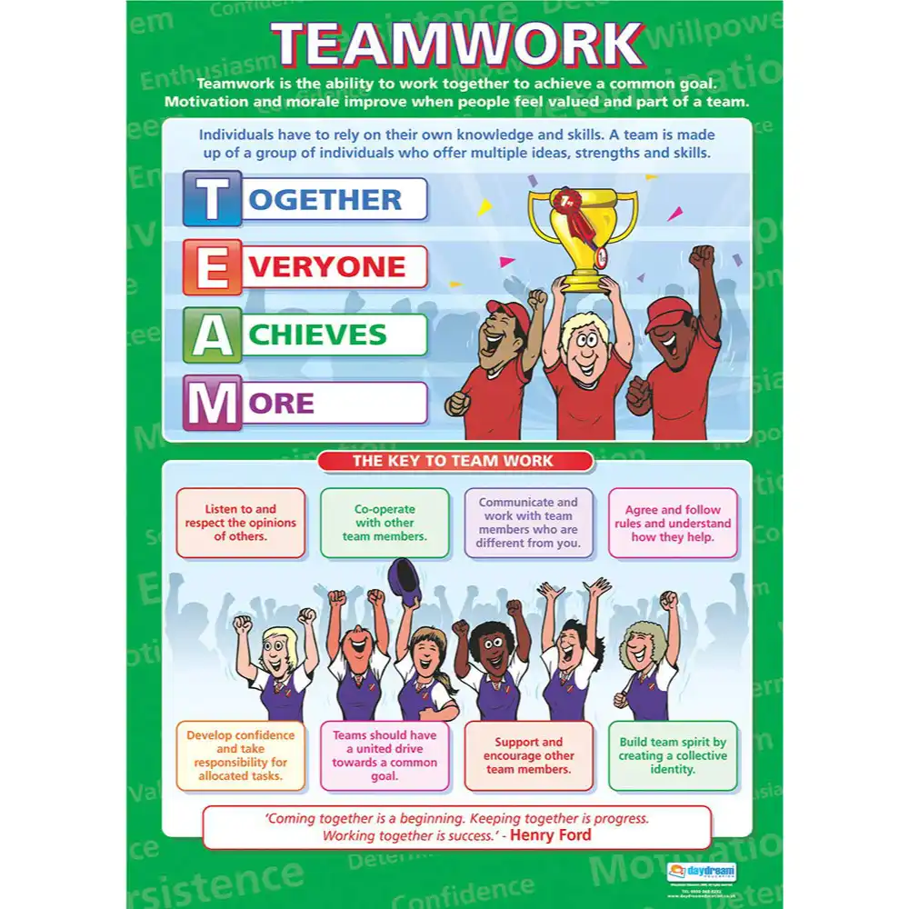 The Teamwork Wall Chart is ideal for classroom walls and school hallways. The large A1 size (840mm x 594mm) makes the bright and informative chart highly readable from a distance, complementing every learning environment.