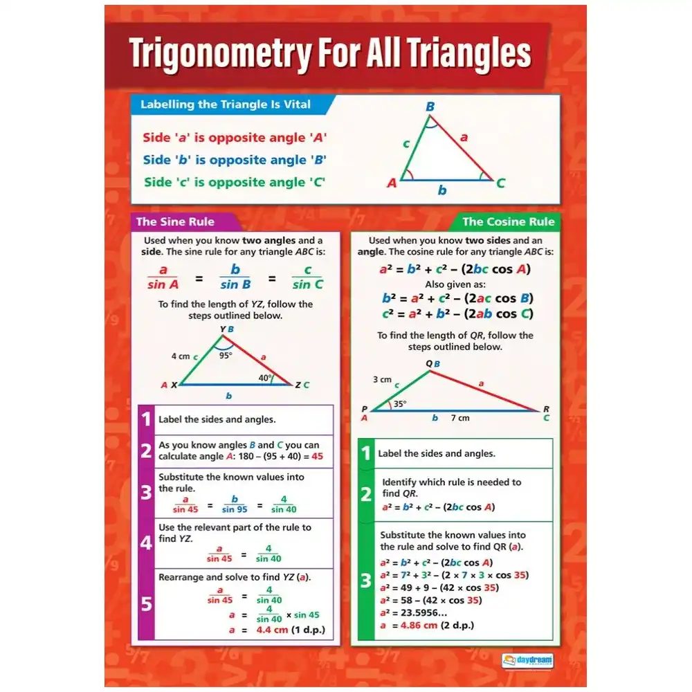 Trigonometry for all Triangles Poster is part of our Maths range. The clear and concise A1 poster outlines the important labels and rules when it comes to Trigonometry for all Triangles. The 3 sections include labelling the triangle is vital, the sine rule and the cosine rule. Each section presents either a diagram or an example of the formulae required for a triangle.