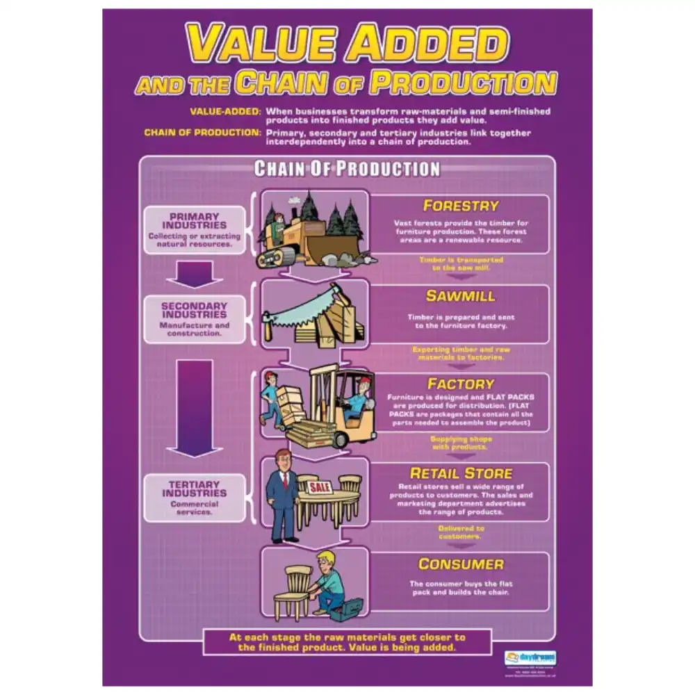 The Value Added Production Wall Chart is ideal for classroom walls and school hallways. The large A1 size (840mm x 594mm) makes the bright and informative chart highly readable from a distance, complementing every learning environment. .