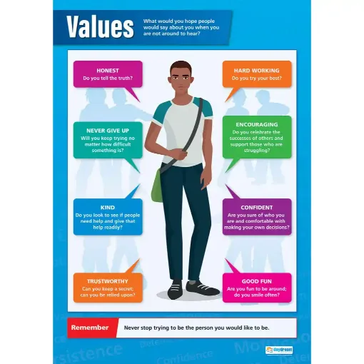 The Values Wall Chart is ideal for classroom walls and school hallways. The large A1 size (840mm x 594mm) makes the bright and informative chart highly readable from a distance, complementing every learning environment.