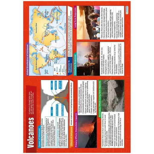 Volcanoes poster is a striking wall chart, guaranteed to catch the attention of all geography students. Covering causes of volcanoes, primary effects, secondary effects, immediate and long-term responses, the large A1 display poster will improve students' understanding through concise and easy-to-read content. With a labelled diagram of a volcano and a world map, alongside several real-life images, the poster is a brilliant visual learning tool for geography students of all abilities.